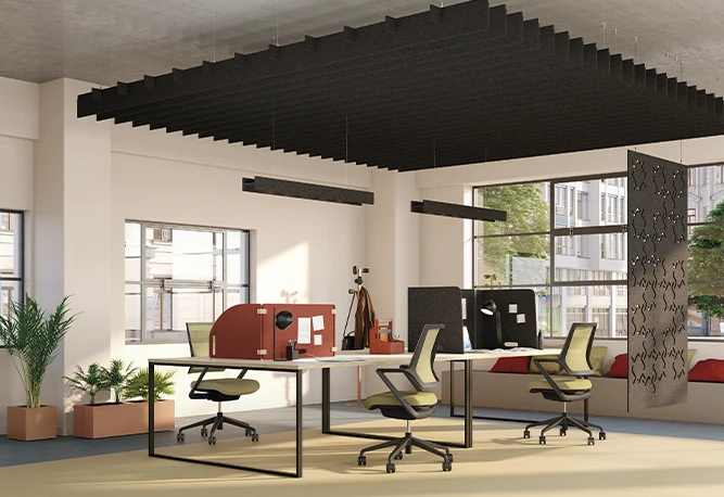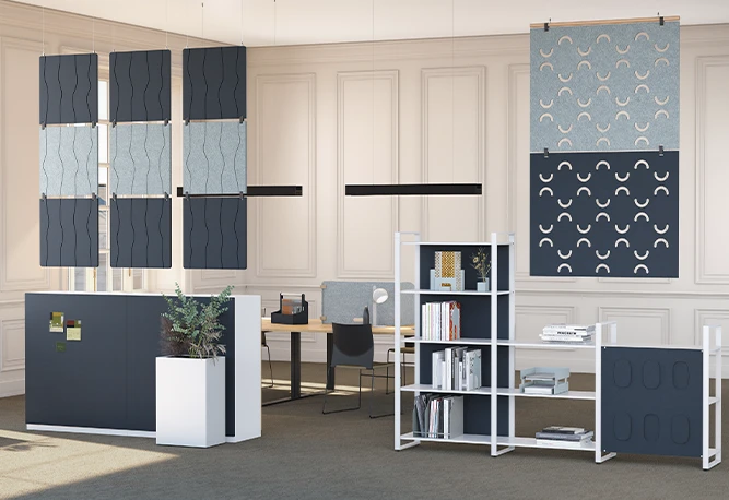 En nuestro portfolio tenemos tanto soluciones fonoabsorbentes de catálogo (paneles de pie, suspendidos a techo, murales, de sobremesa fijos o autoportantes…) como la posibilidad de realizar elementos a medida partiendo de diseños y necesidades específicas, trabajando el cortado y troquelado de paneles de fieltro PET fonoabsorbentes certificados, y con múltiples opciones para optimizar su instalación y dar los mejores resultados.